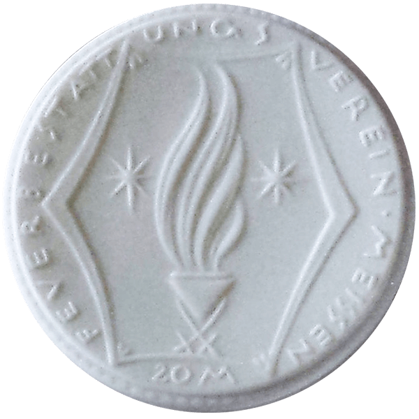 Ohne Jahresangabe (Herstellungsjahr 1921), mit Wertangabe „20 M“ unten, Gipsform (Handform), Steinzeug (braun) = 42 mm Ø, Biskuitporzellan (weiß) = 40 mm Ø. Das Stück trägt auf beiden Seiten einen Perlrand.