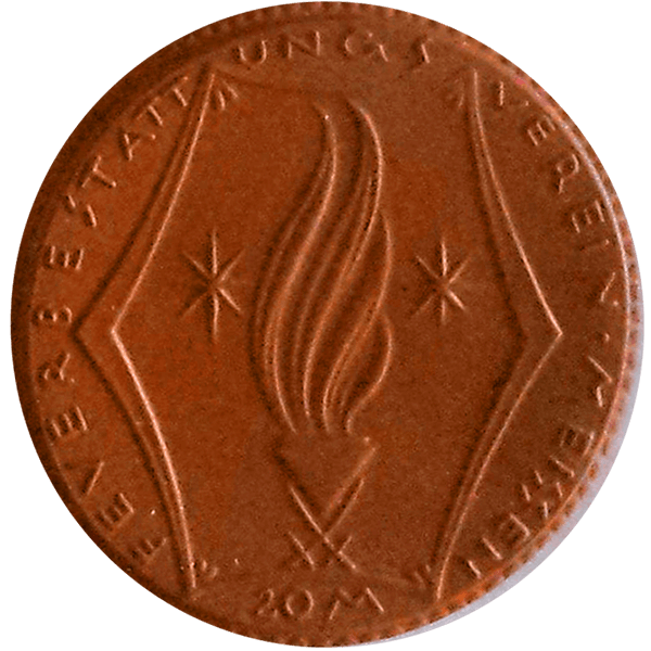 Ohne Jahresangabe (Herstellungsjahr 1921), mit Wertangabe „20 M“ unten, Gipsform (Handform), Steinzeug (braun) = 42 mm Ø. Das Stück trägt auf beiden Seiten einen Perlrand.