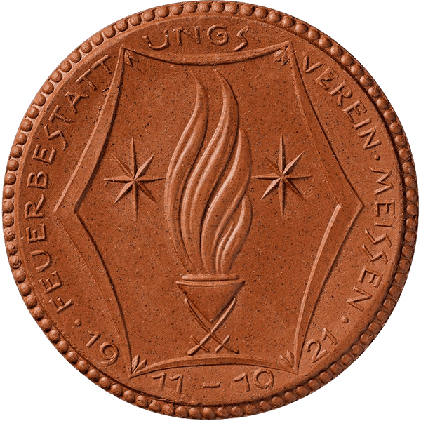 Beschreibung Vorderseite: In dem von gebogenen Doppellinien gebildeten rhombusförmigen Sechseck, welches auch als Sarg gedeutet wird, sind die oberen und unteren Ecken nach innen verziert. Im Sechseck befindet sich eine Urne mit lodernder Flamme, links und rechts je ein achtstrahliger kleiner Stern und die aufrechtstehenden Kurschwerter. Umschrift: FEUER-BESTATTUNGSVEREIN MEISSEN und 1911-1921.